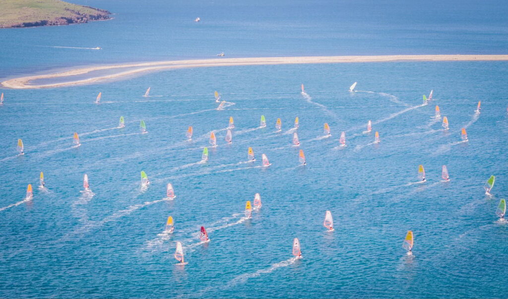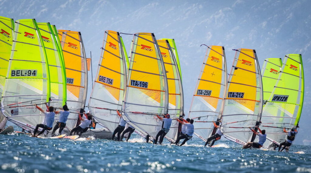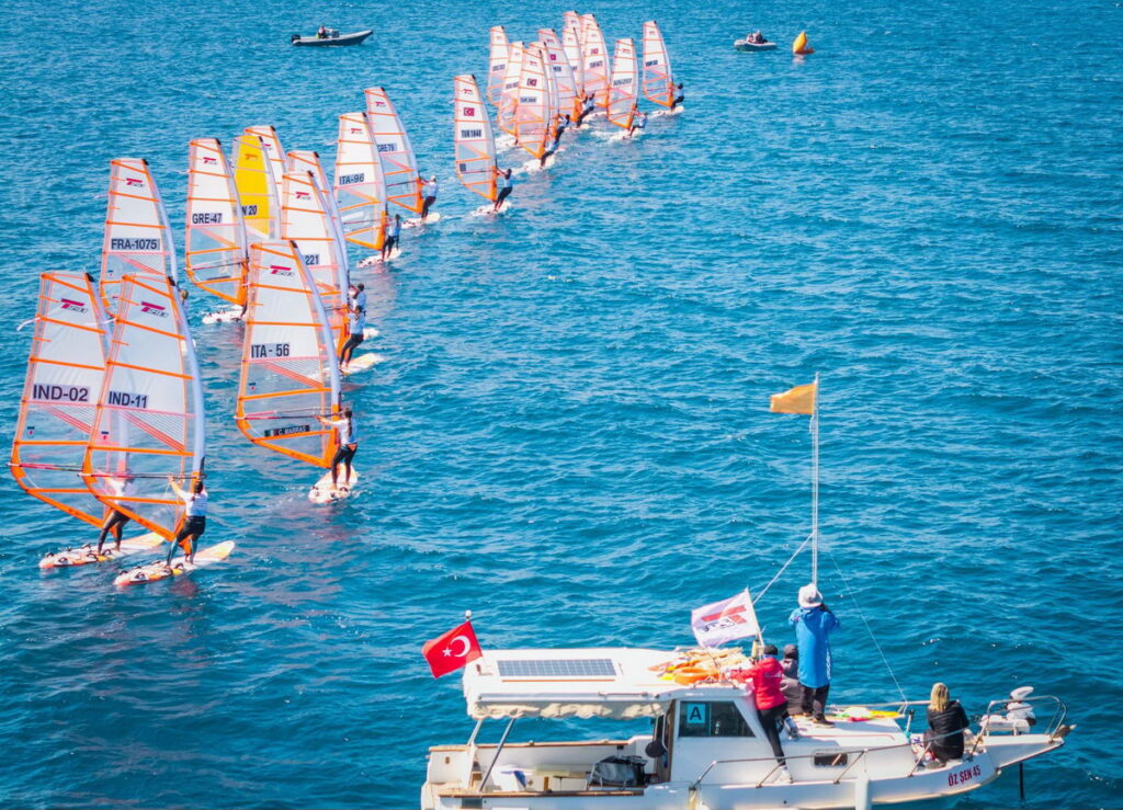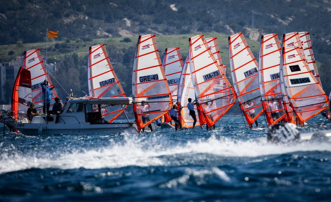 This 2026 World Championship is very lucky with the weather! After a week of rain and very strong winds in the Foca region, a bay located southwest of Izmir in Turkey, a high-pressure system has settled in for the week, bringing smiles back to all the participants and organizers. The resort where the event is taking place is truly ideal: a very sheltered bay, a club/village exclusively reserved for racers and their coaches/parents, large areas of grass to rig the sails, a huge beach for easy launching… it’s hard to imagine anything better. After the traditional opening ceremony, held indoors due to rain, the regatta program kicked off with three consecutive races in winds exceeding 20 knots, catching all the sailors off guard after the winter break. The most physically fit sailors quickly took the lead sailing over a short and heavy chop. On the second day, the wind, which had significantly dropped and varied in both direction and strength, shook up the previous day’s rankings. The sailors faced longer race times and more complex tactics due to the currents circulating in this wide bay dotted with islets, which also change the wind direction. Ashore, the atmosphere is very friendly, with excellent exchanges between competitors. A boat takes spectators out onto the water to watch the race up closer. Truly ideal!…
