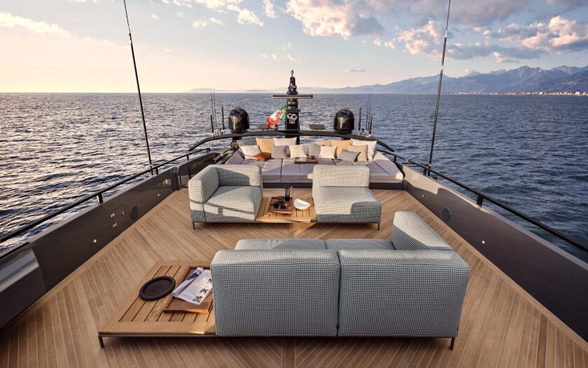 Inside, a sense of freedom prevails through an “open space” philosophy. Massive floor-to-ceiling glass windows flood the salon with natural light, offering 360-degree panoramic views. The yacht is configured to accommodate 10 guests in five luxurious cabins, with dedicated quarters for a crew of five. The flybridge serves as the perfect spot for al fresco dining, featuring a retractable roof that adjusts according to weather conditions.