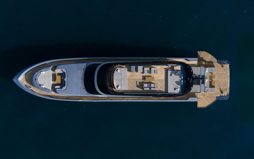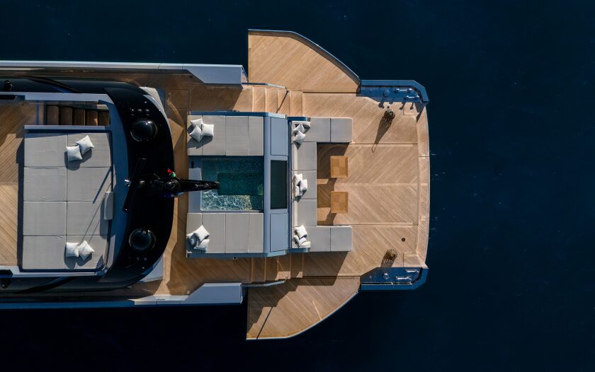 The exterior design focuses on immediate contact with the marine environment, culminating in the spectacular Beach Club that extends over 100 square meters. By deploying the side wings, the stern transforms into a massive “terrace on the sea,” featuring a pool and an ingenious float-in garage system for the tender. A strategic advantage of this model is its extremely shallow draft of just 1.3 meters, allowing access to pristine coves and shallow waters where other yachts of this size cannot reach.