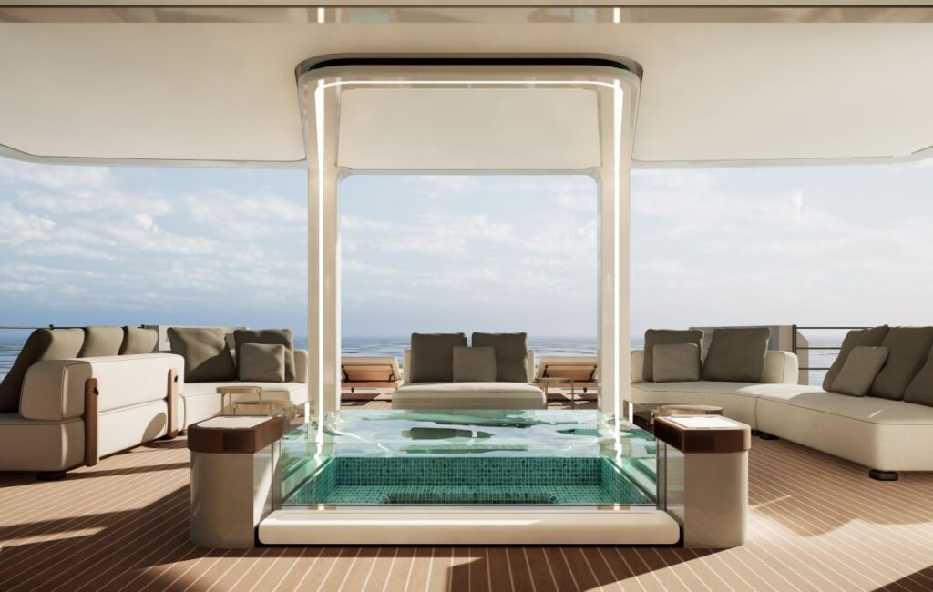 Beyond its outward appearance, the project introduces a significant shift in naval architecture through a redesigned propulsion layout. By condensing the engine room and technical systems into a single deck—rather than the industry-standard two—the studio has unlocked unprecedented interior volume. This spatial efficiency allows for a seamless transition between the main saloon and the aft cockpit. At the heart of this social hub lies a semi-recessed pool, designed to be the primary gathering point for guests.
