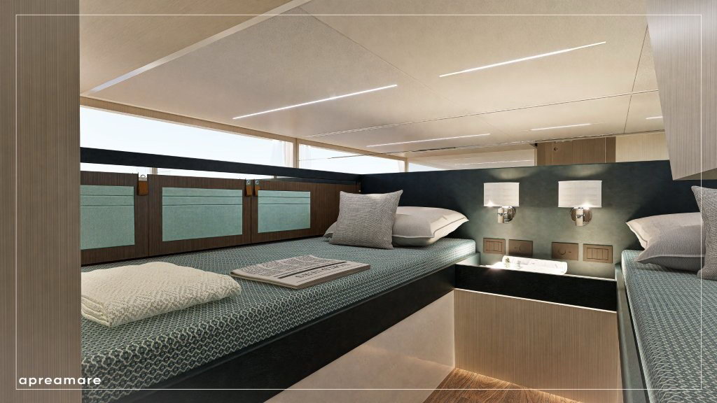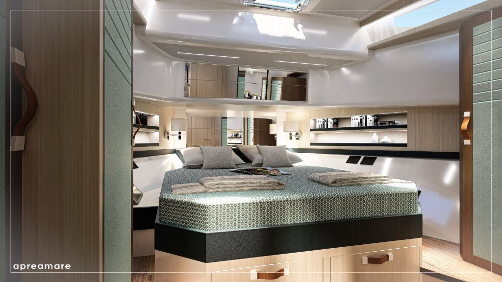 The optional second separate cabin is in the stern, with two beds measuring 200 cm by 95 cm and 200-centimetre-high storage units along the wall. The entire sleeping area is flooded with light that pours in through the new hull and deck windows. In terms of performance at sea, the Gozzo 42 lives up to the high standards set by all Apreamare boats. The variable-geometry hull with skegs is designed for either a conventional in-line shaft drive or a Volvo Penta IPS system, ensuring safety, comfort and high performance in all sea conditions.
