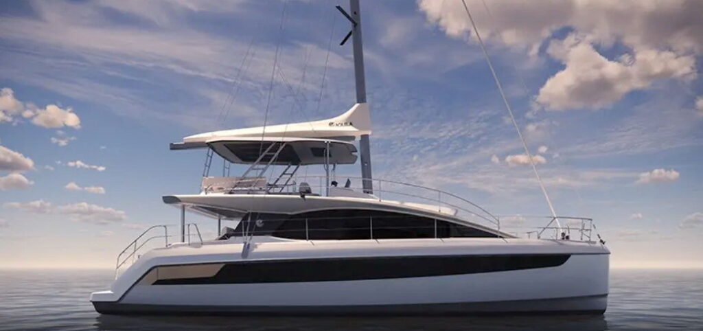 Debuting at Miami, the 50 Sail marks Aquila’s historic first sailing catamaran, merging motor yacht luxury with eco-friendly hybrid performance.
