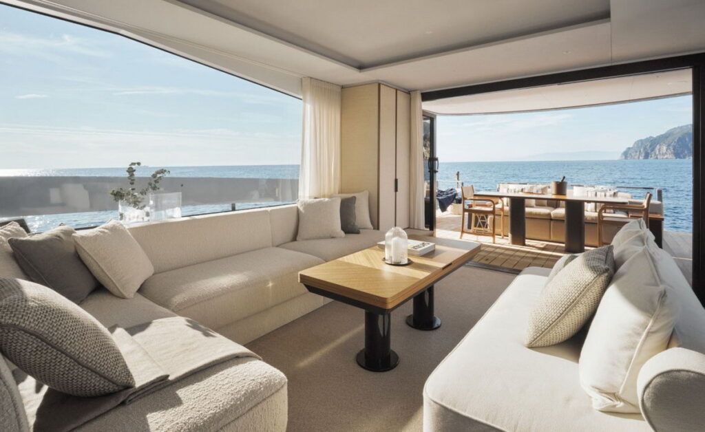 Seadeck 7 represents Azimut’s ability to innovate through the introduction of new design and technological solutions. It is the first model to feature a design concept aimed at bringing guests closer to nature, thanks to the Fun Island – the reinvented cockpit that embraces the sea, designed by Alberto Mancini – and following a conscious design approach developed in collaboration with Matteo Thun & Antonio Rodriguez for the interiors, complemented for the first time by a hybrid-electric system with IPS propulsion by Volvo Penta.
