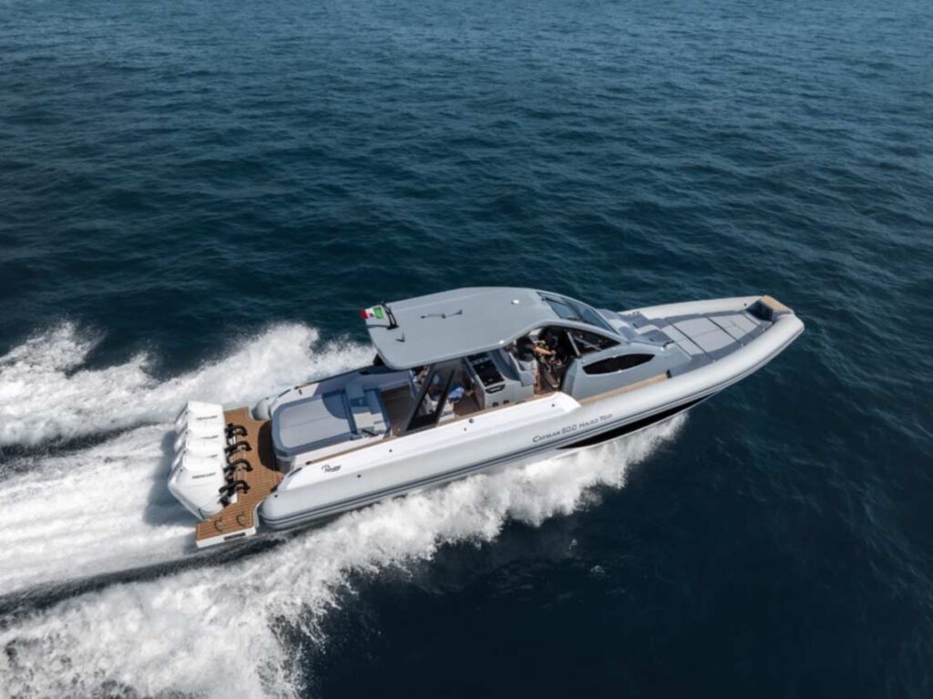 The family-owned company Ranieri has been building boats at its site in Soverato, Calabria, since the 1960s. In 2014, they launched their RIB line. This Cayman line now comprises 15 RIBs, ranging from a 3.65-metre tender to a 14.90-metre luxury RIB. This Cayman 50.0 Hard Top appears light, airy and uncomplicated, but is equipped with a multitude of elaborate details. Sixteen people can spread out across the two seating and reclining areas in the bow and stern. An extendable bathing ladder, shower and hydraulically retractable table transform the cockpit into a bathing platform. Imitation teak flooring and imitation leather railings are a treat for the feet and hands. Below deck, the bow cabin with side and top windows and the stern cabin are complemented by a bathroom with shower and a kitchen with refrigerator and hot water boiler. The double bed in the bow cabin can be converted into a saloon with a table. The 10-tonne RIB is powered by a quartet of outboard motors with 2,000 hp. This makes the helm one of the most popular places on board.