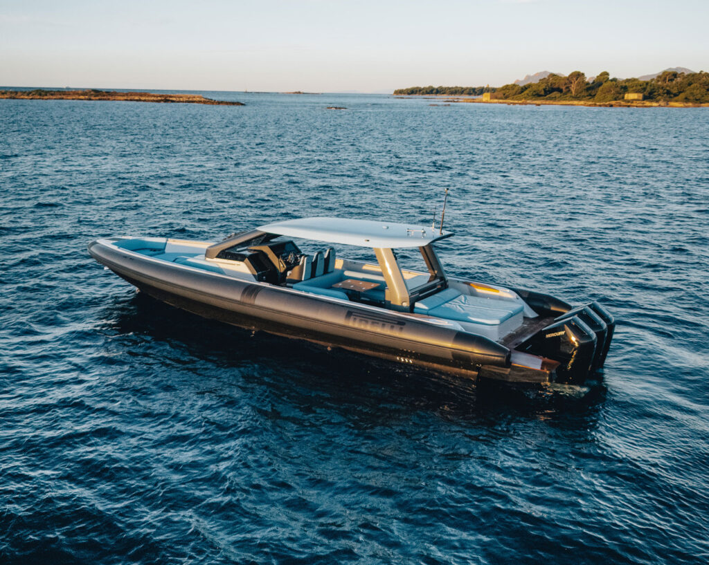 What happens when a leading tire manufacturer and a RIB specialist collaborate? A luxury RIB that is as far removed from the concept of an inflatable boat as you can imagine. The Maxi-RIB Pirelli 47 marks the 20th anniversary of the partnership between Pirelli and SACS Tecnorib. The second-largest Pirelli RIB stretches sleekly over 14.75 meters. The streamlined tubes are located above the waterline. This means they do not have to displace water, but stabilize the boat when cornering and in rough seas. Three outboard motors with a total output of 1,275 hp are mounted on the bathing platform. The three-seater helm and the variable seating area in the cockpit are covered by a hardtop with a steeply raked windscreen. In the closed version, window elements close the sides flush between the windscreen and the T-beam. Four different layouts are pre-planned for the cockpit, from sun loungers to dining tables. A bathroom with standing room is enclosed in the cabin of the Pirelli 47. Pirelli and SACS Tecnorib could not have given themselves a more beautiful gift for their 20th anniversary than this RIB.