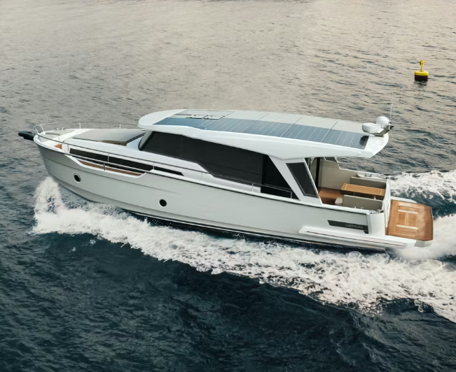 The Slovenian shipyard Greenline is committed to a consistent design language but different types of propulsion. Its models, ranging from the smallest 39 to the 58 Fly, vary the classic motorboat line with a high foredeck, stepped sideline and deep, covered stern. As recognizable as they are in design, they are just as flexible in terms of motorization. Most of their models are available with hybrid, diesel or electric motors. The new Greenline 42 is the third smallest in the nine-model range – and the most decisive. With this 14-metre yacht, Greenline has consistently honed the qualities of its sister ships. Ten solar panels on the roof provide 4.3 kW of power, enough to supply all the electricity-consuming devices on board. No engine needs to run at anchor. The cockpit furniture can be completely removed and the stern side wall folded down, transforming the dining area into a bathing platform. The lounge on the foredeck has been taken from its big sister, the Greenline 58. This sense of grandeur can be felt throughout the ship.