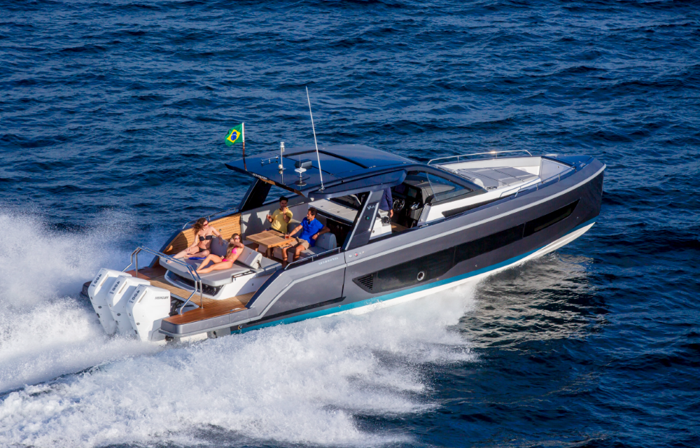 The Brazilian shipyard Schaefer can point to a model range that is as broad in terms of types as it is in terms of design diversity. From the imposing flybridge model to the walkaround speedboat with T-top, they range from cool and sleek to luxurious and playful designs. The V34 walkaround model, which is a good 10 meters long with a vertical stem and sloping windscreen, clearly opts for the first design variant. With its straight lines, it looks just as maneuverable as it is to drive. The larger V44 is as variable in its deck layout as it is in its propulsion options. You can choose between sterndrive, IPS and triple outboard engines. With fold-downside walls in the cockpit area and a hydraulic bathing platform, the beach club is always at your fingertips. The high-sided racing wedge Schaefer 380 is as seaworthy as it is comfortable. Behind the wide front of the helm station, life on board unfolds in the stern between the covered saloon and the cockpit with fold-downside walls. Below deck there are two double cabins, a full galley and a bathroom with separate shower. Schaefer V34/V44/300, three very different models, but unmistakably three times Schaefer quality.