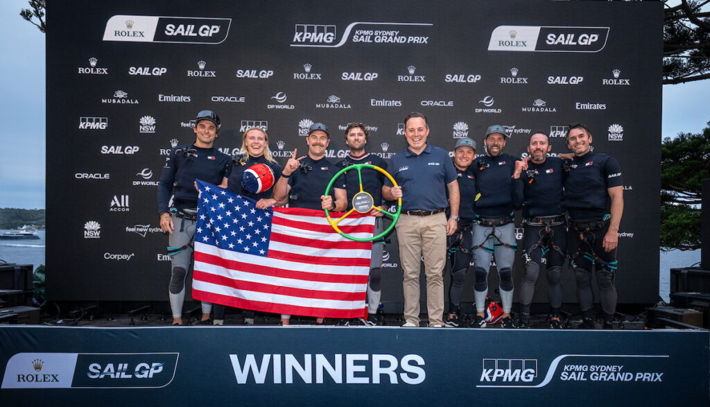 The U.S. SailGP Team has won the KPMG Sydney Sail Grand Prix, sailing to victory ahead of Emirates GBR in second and Los Gallos in third. It marks the team’s first event win since Cádiz in Season 4, and Canfield’s first ever in SailGP – a moment he called, “an incredible feeling.” The Americans were the form team on a light, tricky Championship Sunday, with consistent performances (3, 1, 6) in the final qualifying fleet races of the weekend. As crews struggled in the disturbed air – with foiling conditions limited at the very bottom of the wind range – the Americans managed, for the most part, to stay out of the pack.