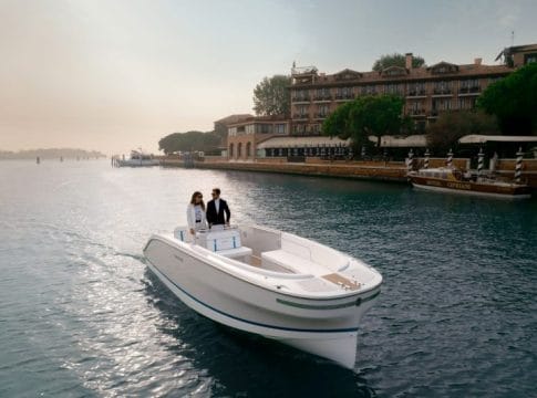 The tender’s futuristic styling and catamaran hull configuration gives a 4.4m beam that allows for an open-plan arrangement and seating for 18 guests. There’s a head, streamlined galley, and a forward hydraulic door for effortless beach landings.