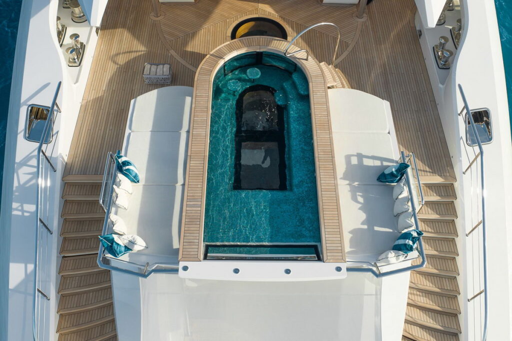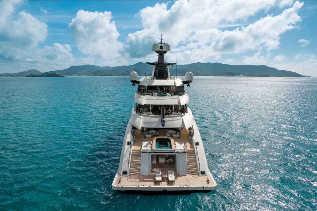 The curved lines of the yacht’s dynamic silhouette sweep down from the bow on the Upper Deck to the beach club and merge into the wake when cruising. The main mast dominating the entire structure completes the elegant combination of curved forms that make this yacht unique.