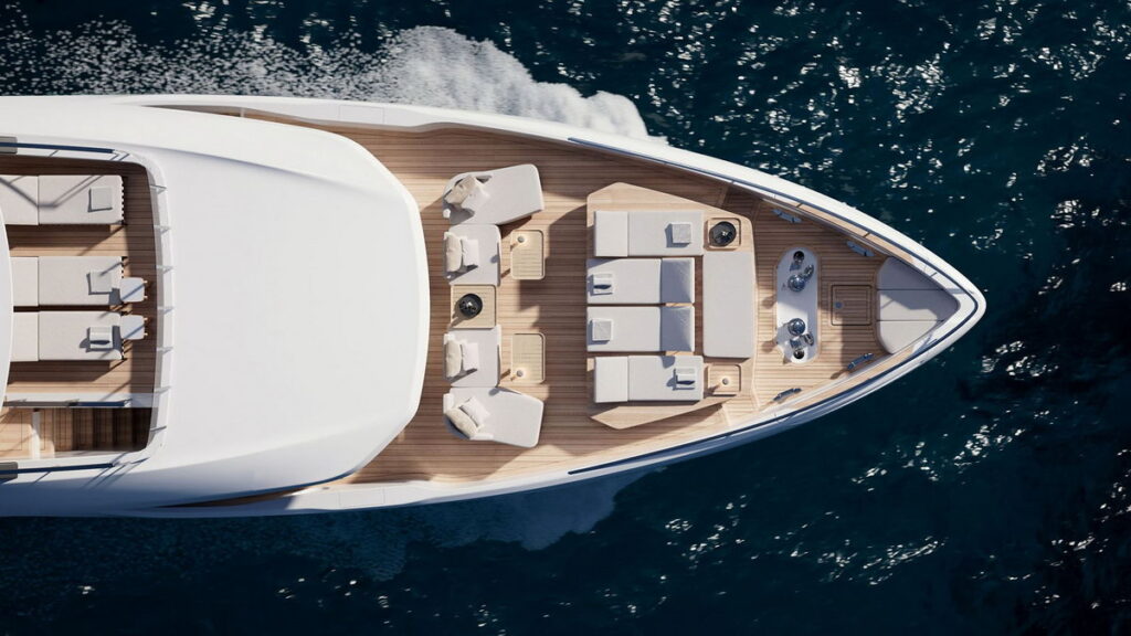 The exterior styling is the work of Italian designer Filippo Salvetti, who created a dynamic and modern profile inspired by the tension, vigor, and aerodynamic lines of sports cars. The design focus is placed squarely on the connection with the sea, particularly through the redesign of the stern area, which strengthens the visual and physical link to the water. A notable functional feature in this new design is the movement of the exterior staircase; instead of being situated in a central position aft, it has been moved to amidships. This strategic change allows for increased space on the aft decks as well as optimum functionality throughout the yacht’s exterior layout.