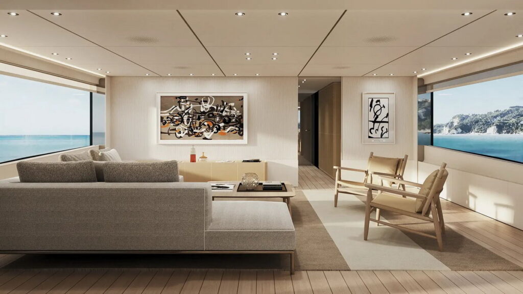 Internally, the signature comes from the renowned ACPV Architects Antonio Citterio Patricia Viel, with the Custom Line Atelier providing strategic consulting. The interior design philosophy focuses on bright and airy spaces filled with natural light, achieved through the extensive use of glass throughout the living areas, ensuring a continuous connection with the environment outside. The designers have developed three distinct concepts—Light Mood, Contrast Chocolate Mood, and Contrast Oyster Mood—offering owners the ability to choose between a bright, contemporary aesthetic with natural colors, a more rigorous style defined by dark leather and stone, or an understated, timeless appearance. Additionally, the interior staircase has been moved to a starboard position, cleverly concealed behind a reflective surface to allow for a generous, light-filled hallway without obstructions.
