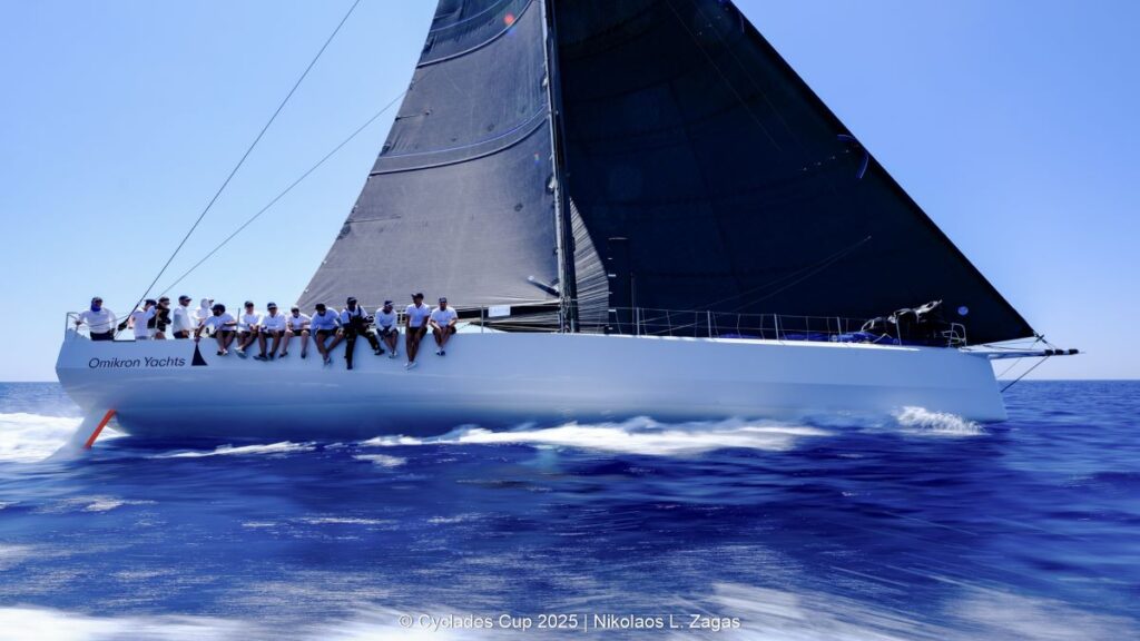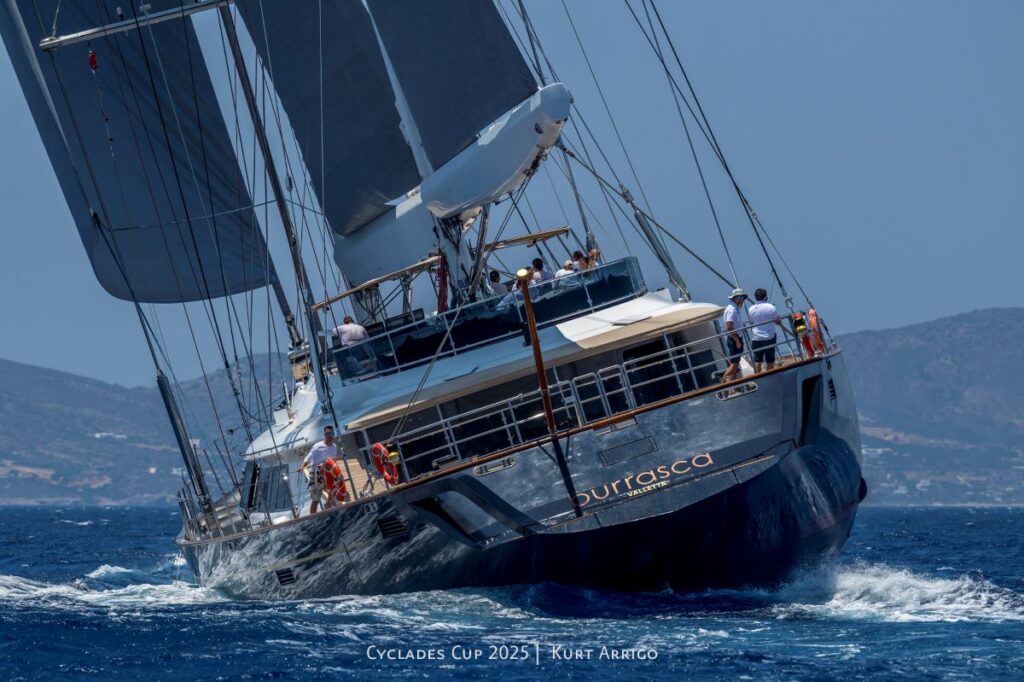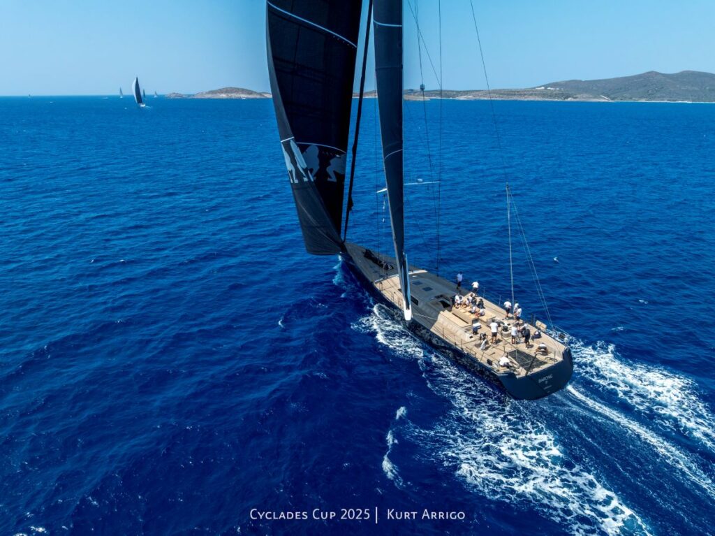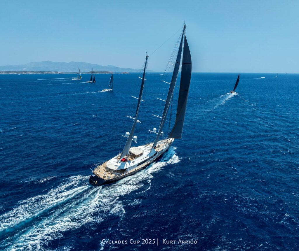 Another notable contender is Almyra II, the impressive 50-metre Perini Navi sailing yacht owned by the regatta’s co-founder Ilia Rigas. With her elegant lines and powerful sail plan, the yacht has become one of the recognisable figures of the Cyclades Cup fleet.