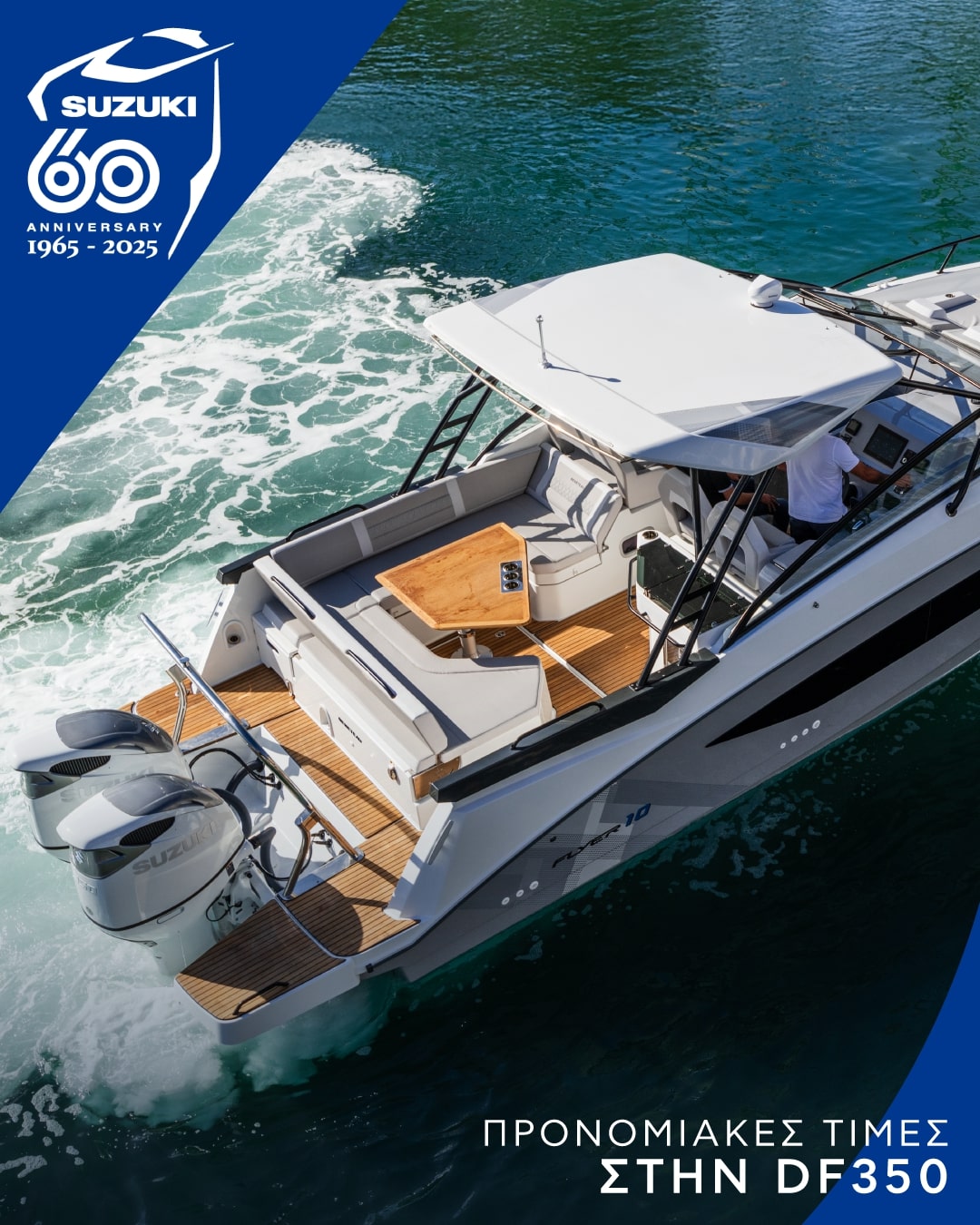 Με αφορμή τη συμπλήρωση 60 χρόνων από την παρουσίαση της πρώτης εξωλέμβιας μηχανής της Suzuki τον Απρίλιο του 1965, η Suzuki Marine και η Νικ. Ι. Θεοχαράκης Α.Ε. γιορτάζουν αυτή τη σημαντική επέτειο με μοναδικές προνομιακές τιμές για τον DF350, τον κινητήρα που ενσαρκώνει την τεχνολογική υπεροχή και την αξιοπιστία της Suzuki.
