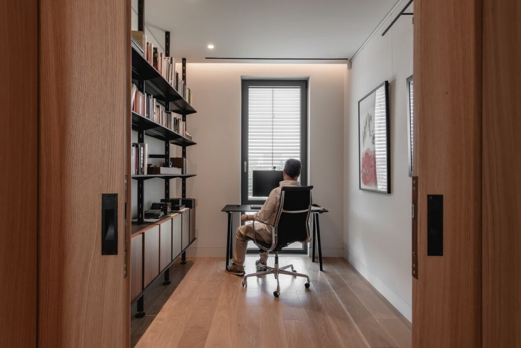 Στους διαδρόμους και τους κοινόχρηστους χώρους, ο διακριτικός αυτός χειρισμός του φωτισμού δημιουργεί μια φυσική ροή που οδηγεί το βλέμμα χωρίς να το κουράζει. Το φυσικό φως που εισέρχεται από τα μεγάλα ανοίγματα συνυπάρχει αρμονικά με τον τεχνητό φωτισμό καθ’ όλη τη διάρκεια της ημέρας, σε έναν συνεχή και ισορροπημένο διάλογο.