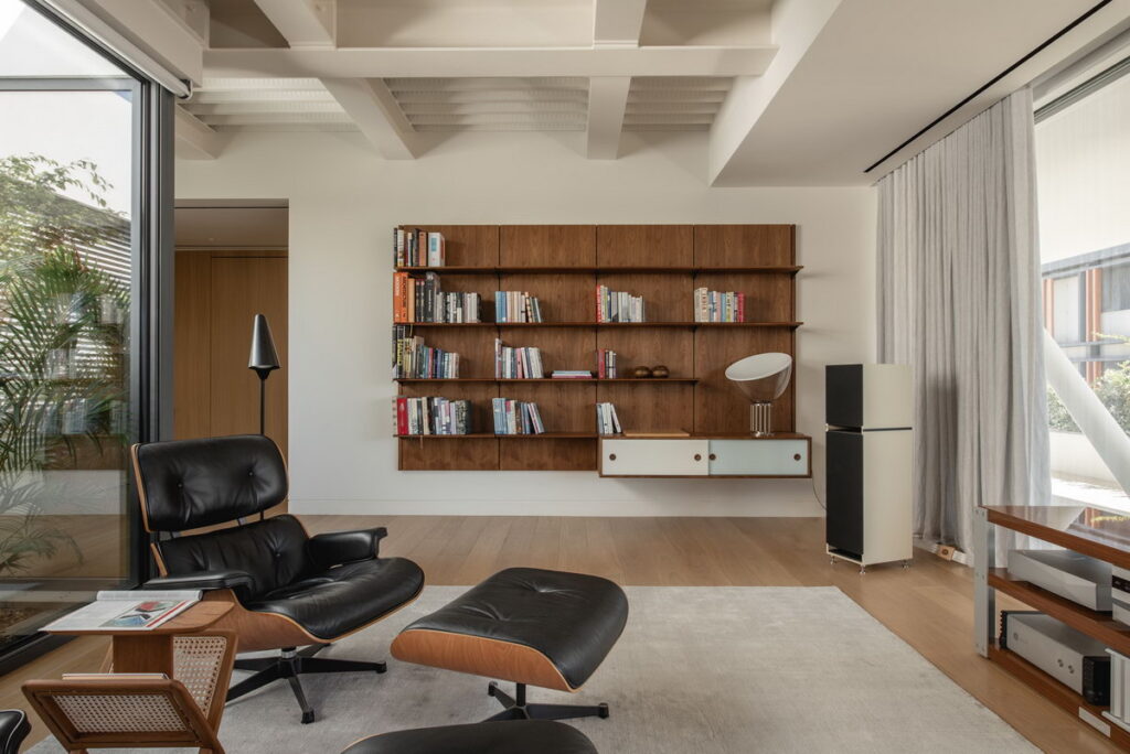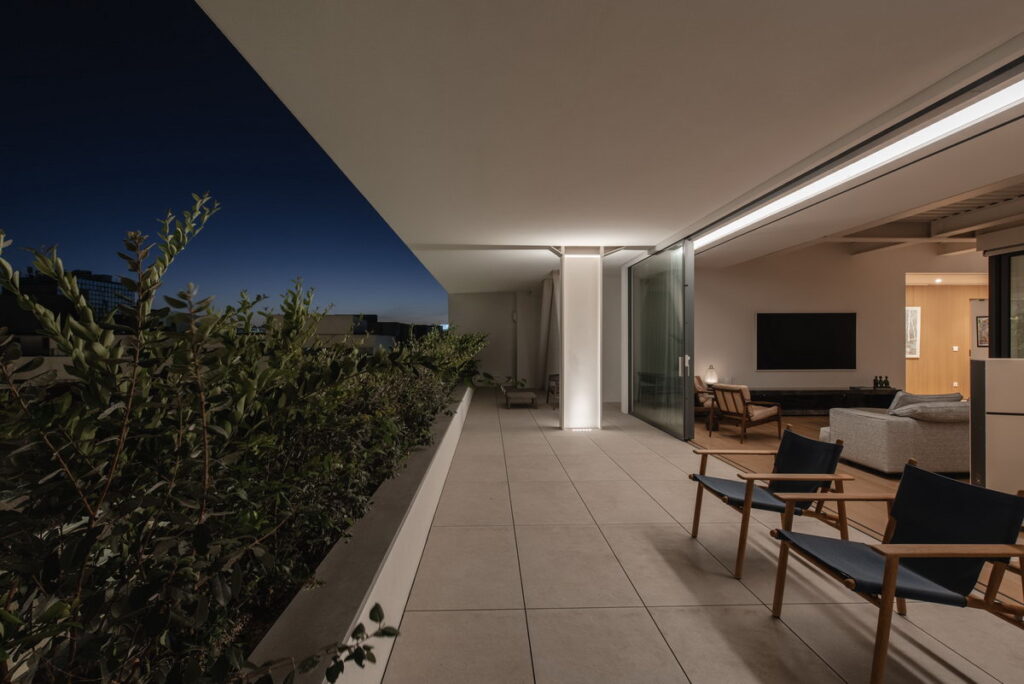 Η φύση δεν αποτελεί απλώς φόντο, αλλά βρίσκεται στον ίδιο τον πυρήνα της κατοικίας, φέρνοντας το εξωτερικό περιβάλλον στην καρδιά της καθημερινής ζωής. Το πράσινο επεκτείνεται και στις βεράντες που περιβάλλουν το κτίριο, οι οποίες αντιμετωπίστηκαν με την ίδια σχεδιαστική φροντίδα.