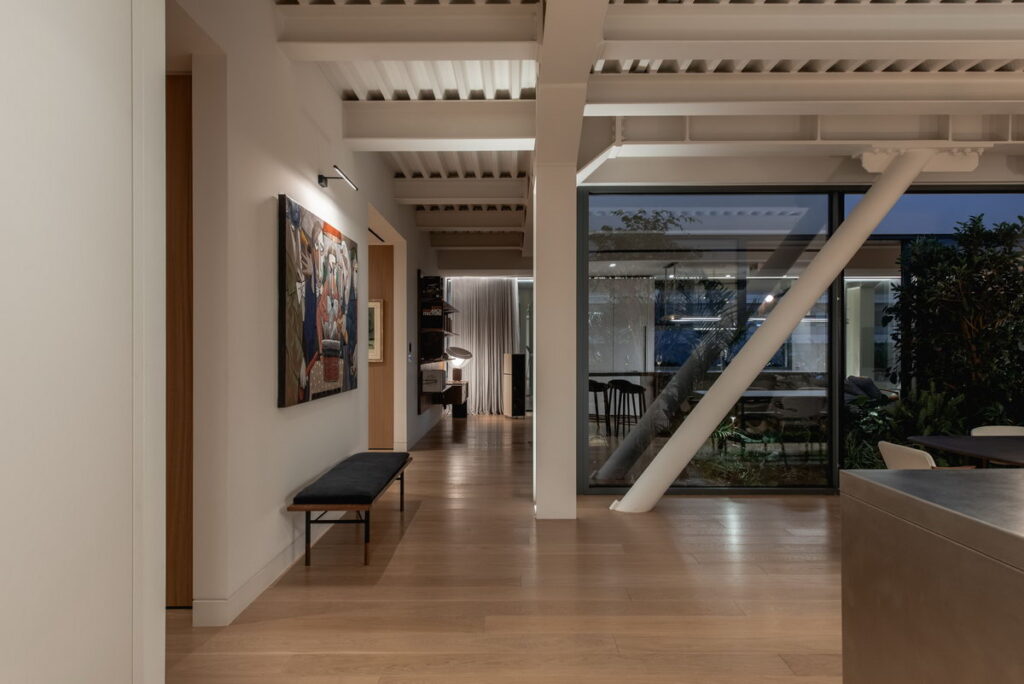 Γραμμικά uplighters ενσωματώθηκαν με ακρίβεια κατά μήκος των μεταλλικών δοκών, φωτίζοντάς τις από κάτω και αναδεικνύοντας τη στιβαρή τους παρουσία. Χωνευτά σποτ και κρυφές γραμμικές πηγές LED ενσωματώθηκαν με απόλυτη ακρίβεια στις κατασκευές, ώστε οι ίδιες οι πηγές να παραμένουν αόρατες. Το φως μοιάζει να αναβλύζει από τα ίδια τα δομικά στοιχεία, χωρίς τίποτα να διαταράσσει την οπτική ηρεμία του χώρου.