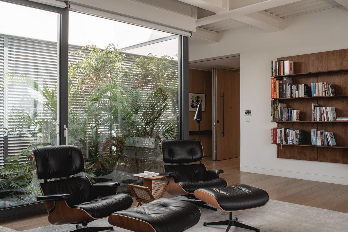 Η φύση δεν αποτελεί απλώς φόντο, αλλά βρίσκεται στον ίδιο τον πυρήνα της κατοικίας, φέρνοντας το εξωτερικό περιβάλλον στην καρδιά της καθημερινής ζωής. Το πράσινο επεκτείνεται και στις βεράντες που περιβάλλουν το κτίριο, οι οποίες αντιμετωπίστηκαν με την ίδια σχεδιαστική φροντίδα.