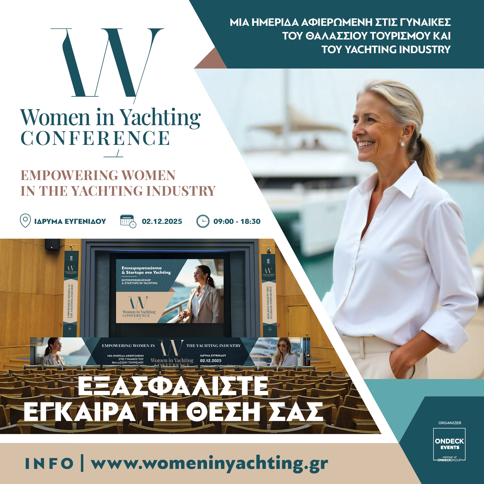 Η ONDECK Media ανακοινώνει με ιδιαίτερη χαρά το πρόγραμμα του «Women in Yachting Conference», το οποίο θα πραγματοποιηθεί στις 2 Δεκεμβρίου στο Ίδρυμα Ευγενίδου. Πρόκειται για ένα συνέδριο που δημιουργήθηκε για να φωτίσει τις ιστορίες, τα επιτεύγματα και τον ρόλο των γυναικών στον θαλάσσιο τουρισμό, το yachting, τη ναυτιλία και την επιχειρηματικότητα. Με πυρήνα το όραμα της ONDECK για ουσιαστικό διάλογο και ανάδειξη πρωτοβουλιών που εξελίσσουν τον κλάδο, το συνέδριο, με κεντρικό μότο το “Business Inspiration”, επιδιώκει να δώσει βήμα σε γυναίκες που τόλμησαν, προχώρησαν μπροστά και σήμερα αποτελούν έμπνευση για τις επόμενες γενιές.