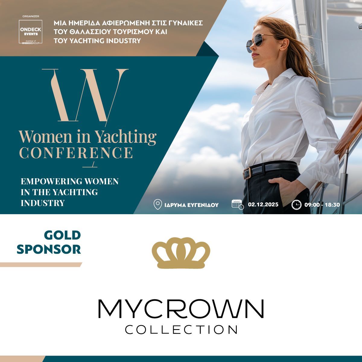 Η ONDECK Media παρουσιάζει με ιδιαίτερη χαρά τον Χρυσό Χορηγό του φετινού Women in Yachting Conference, τη MyCrown, μια δημιουργική και πρωτοποριακή εταιρεία που εκπροσωπεί επάξια την έννοια της σύγχρονης γυναικείας επιχειρηματικότητας. Το συνέδριο θα πραγματοποιηθεί στις 2 Δεκεμβρίου στο Ίδρυμα Ευγενίδου, επιδιώκοντας να αποτελέσει σημαντικό φορέα ενδυνάμωσης της γυναικείας παρουσίας στο yachting, τον θαλάσσιο τουρισμό και τη ναυτιλία.