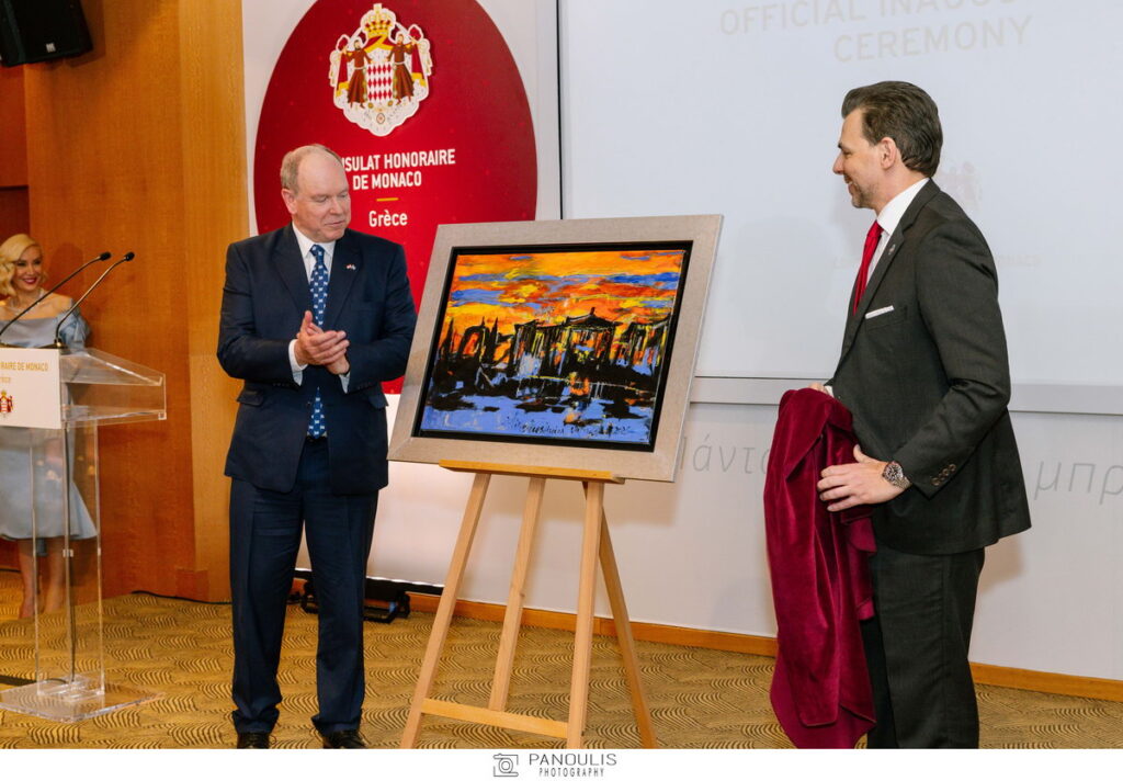 Ξεχωριστή στιγμή ήταν η προσφορά ενός ιδιαίτερου έργου τέχνης από τον Επίτιμο Πρόξενο, Δρ. Βασίλη Γ. Αποστολόπουλο, προς τον Πρίγκιπα Αλβέρτο Β’. Το έργο έφερε την υπογραφή της διακεκριμένης Ελληνίδας εικαστικού κυρίας Μίνας Βαλυράκη. Με τη σειρά του ο Πρίγκιπας Αλβέρτος Β΄ προσέφερε στον Επίτιμο Πρόξενο, Δρ. Β. Αποστολόπουλο ένα συμβολικό δώρο, το οποίο από σήμερα κοσμεί το Επίτιμο Προξενείο του Μονακό στην Ελλάδα.