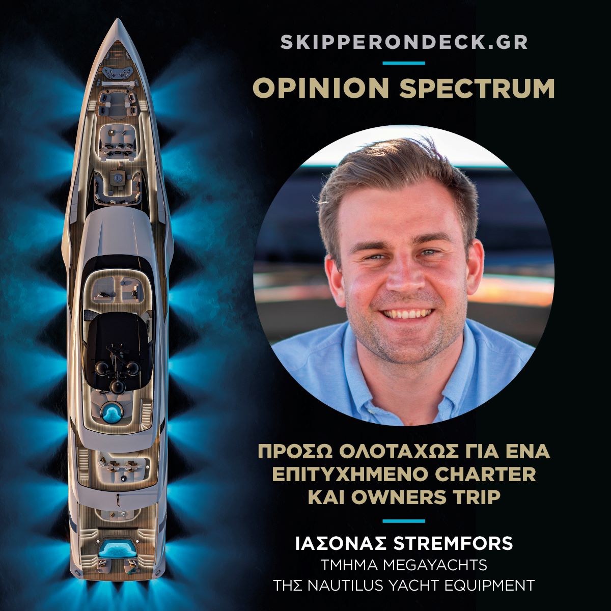 O Ιάσoνας Stremfors εργάζεται στο τμήμα Megayachts της Nautilus Yacht Equipment. Αποτελεί μεταπτυχιακός φοιτητής του ALBA MBA και έχει προηγούμενη προϋπηρεσία ως αξιωματικός στην ποντοπόρο ναυτιλία, στο Ελληνικό Charter Yachting, στο management team της IYC στην Ελλάδα και έχει αποτελέσει μέλος της συντακτικής ομάδας του περιοδικού Ναυτικά Χρονικά.