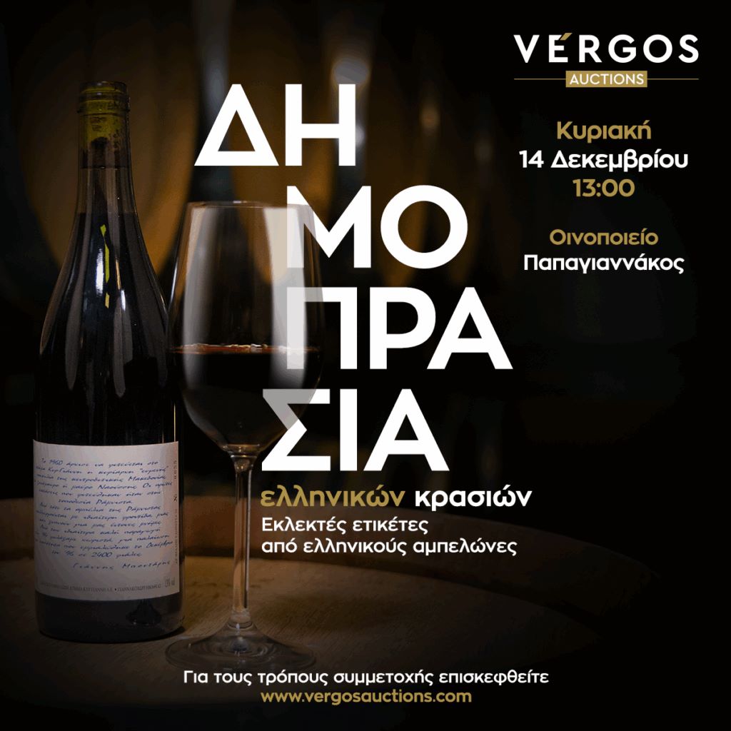 Η VERGOS Auctions ανοίγει ένα νέο κεφάλαιο για την ελληνική οινική παραγωγή και εγκαινιάζει μια νέα κατηγορία δραστηριότητας για τον Οίκο, διοργανώνοντας για πρώτη φορά δημοπρασία αποκλειστικά αφιερωμένη στο ελληνικό κρασί. Η δημοπρασία θα πραγματοποιηθεί παρουσία κοινού την Κυριακή 14 Δεκεμβρίου 2025 στις 13:00 στο Οινοποιείο Παπαγιαννάκος στο Μαρκόπουλο Αττικής, με στόχο να αναδείξει τη μοναδικότητα, την ποιότητα και τη διεθνή δυναμική της σύγχρονης ελληνικής οινοποιίας.