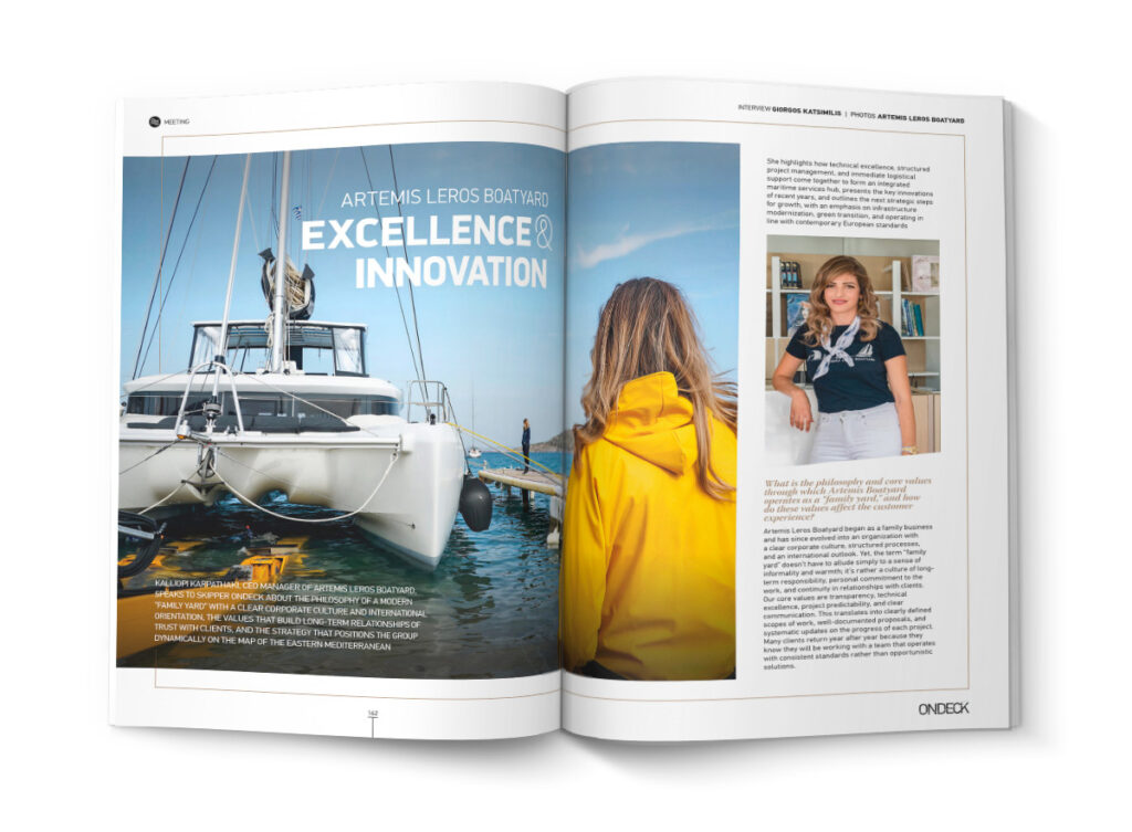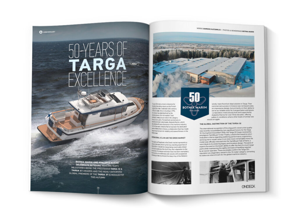 Στις σελίδες της ενότητας φιλοξενούνται επίσης οι Botnia Marin και Atalanta Marine, που γιορτάζουν μισό αιώνα επιτυχιών με τις βραβεύσεις των Targa 32 & 41 και την πολυαναμενόμενη παγκόσμια πρεμιέρα του Targa 37 το φθινόπωρο. Παράλληλα, παρουσιάζεται η Leros Marina – Evros S.A., η οποία αναδεικνύεται σε έναν κορυφαίο θαλάσσιο κόμβο, συνδυάζοντας την τεχνική τεχνογνωσία με τη στρατηγική καινοτομία.