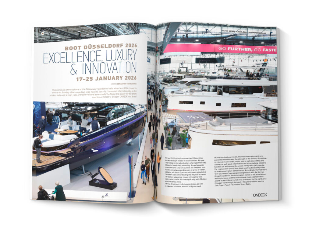Το Skipper ONDECK για μία ακόμη χρονιά βρέθηκε στην καρδιά της boot Düsseldorf 2026, η οποία προσέλκυσε πάνω από 200.000 επισκέπτες από 110 χώρες. Η έκθεση ξεχώρισε για τον εντυπωσιακό αριθμό σκαφών και τις πολυάριθμες παγκόσμιες πρεμιέρες σε ιστιοπλοϊκά και μηχανοκίνητα. Παράλληλα, οι τεχνολογικές καινοτομίες και το blue innovation dock ανέδειξαν το μέλλον της βιώσιμης ναυτιλίας, ενώ η καμπάνια «love your ocean» υπογράμμισε τη σημασία της προστασίας των θαλάσσιων οικοσυστημάτων.