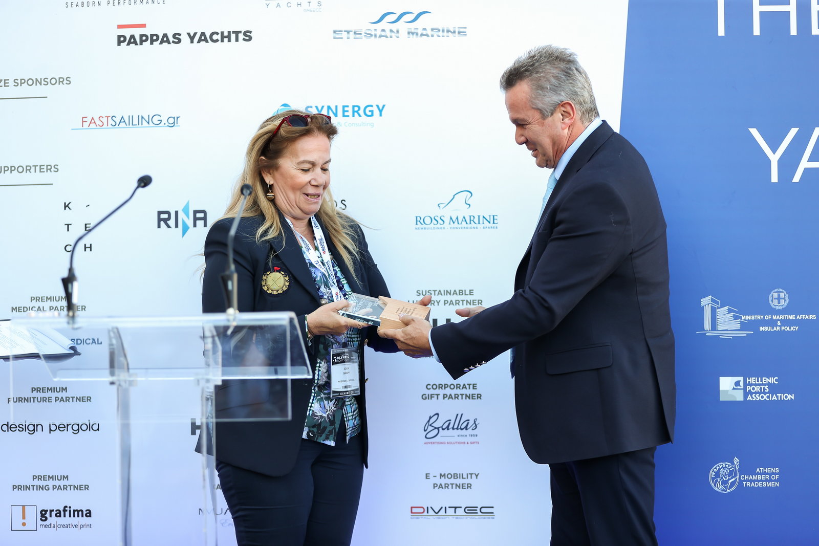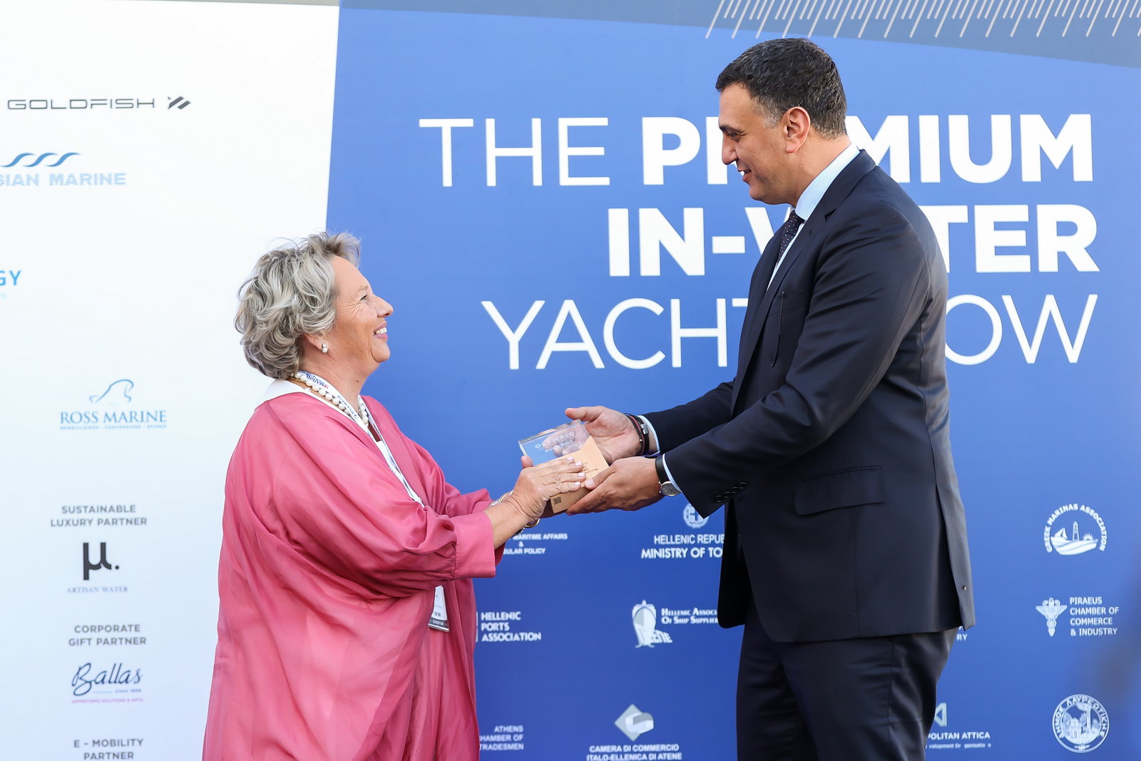 Στη σκηνή των εγκαινίων ανέβηκε στη συνέχεια η κ. Μαίρη Γκογκόση, η οποία παρέλαβε από τον Βασίλη Κικίλια, Υπουργό Ναυτιλίας και Νησιωτικής Πολιτικής, την τιμητική πλακέτα για τη δράση εδώ και 4 δεκαετίες της εταιρείας MG Yachts and Villas και την προσφορά της στον χώρο του yachting.