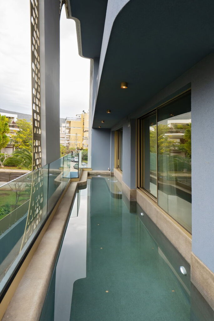 Η ευρύχωρη βεράντα λειτουργεί ως προέκταση του σαλονιού, ενώ η πισίνα με την απευθείας πρόσβαση από το υπνοδωμάτιο ενισχύει τη συνολική εμπειρία κατοίκησης, αξιοποιώντας πλήρως το μεσογειακό φως και το κλίμα.