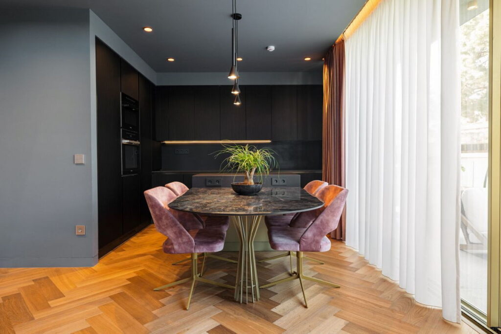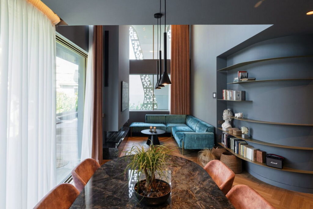 Οι ψηλοτάβανοι χώροι και τα μεγάλα ανοίγματα επιτρέπουν στο φυσικό φως να πλημμυρίζει το διαμέρισμα, ενισχύοντας την αίσθηση άνεσης και φωτεινότητας, ενώ παράλληλα επιτυγχάνεται μια φυσική συνέχεια μεταξύ εσωτερικού και εξωτερικού χώρου.