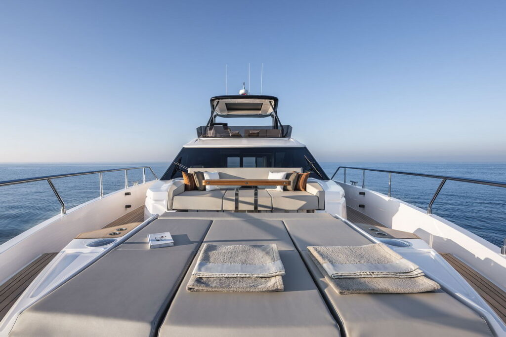In the boat’s central section, on the port side, the dining area accommodates up to eight guests around an elegant table, while a storage unit opposite combines practicality and style for convivial moments in absolute comfort. Continuing along the main deck, the most important new feature is clear separation between dining/living area and galley/wheelhouse, made possible by the introduction of a sliding glass door and, as an additional option, an electrically operated hi-lo glass panel for access to the galley. The result is a semi-enclosed environment that delivers greater privacy and on-board comfort. The galley, by Ernestomeda, has an exit onto the port side walkway, designed to allow crew to move around easily without having to cross the main living areas. The standout new features in the wheelhouse are the windscreen with no central pillar, providing superb visibility and now a brand hallmark, and up to four 16-inch displays on the instrument panel.The setting is completed by the new Poltrona Frau pilot chairs and the glazing features infrared (IR) protective films that reduce solar radiation and translate into more efficient air conditioning.Finally, the wheelhouse electronics have been upgraded for increased responsiveness. In the bow, a complete living area with a deep sofa, a sun pad and an optional teak table provides the ideal space for the owner and guests to spend relaxing al fresco moments.