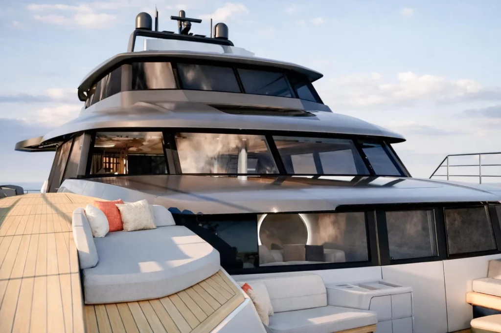 Every element of the FPY120 is designed with continuity in mind, allowing indoor and outdoor living to flow effortlessly. This architectural approach creates a sense of calm, understated sophistication that permeates the entire vessel. The main living areas are truly panoramic, opening up to nearly 290-degree views that reinforce a constant connection to the sea. Whether in the expansive social lounges or the more intimate retreats, guests are always invited to engage with the horizon.