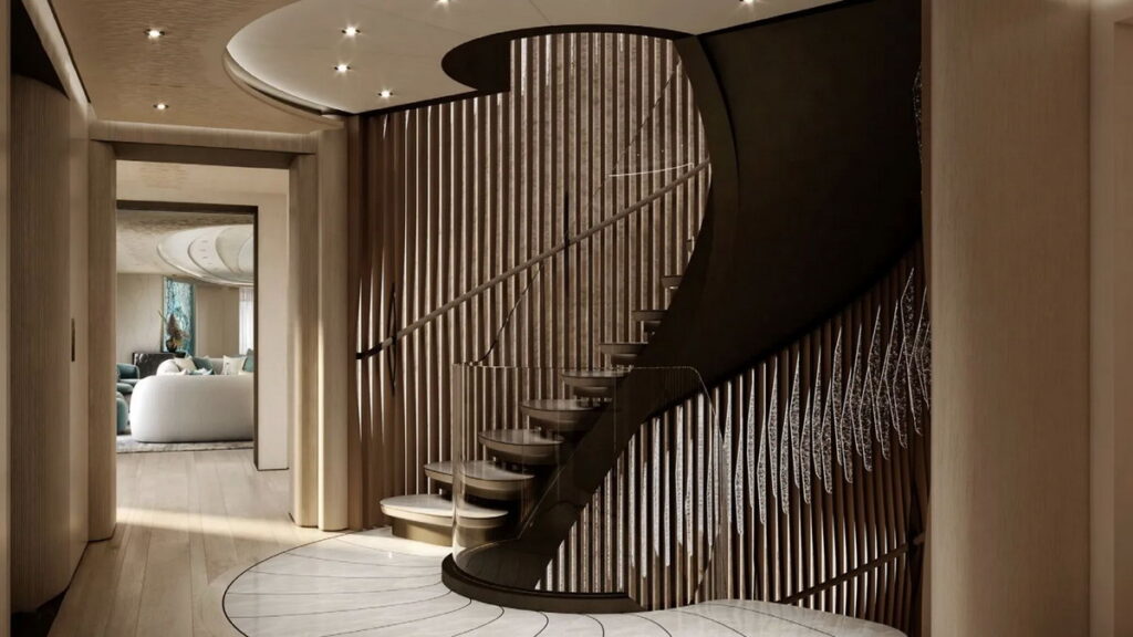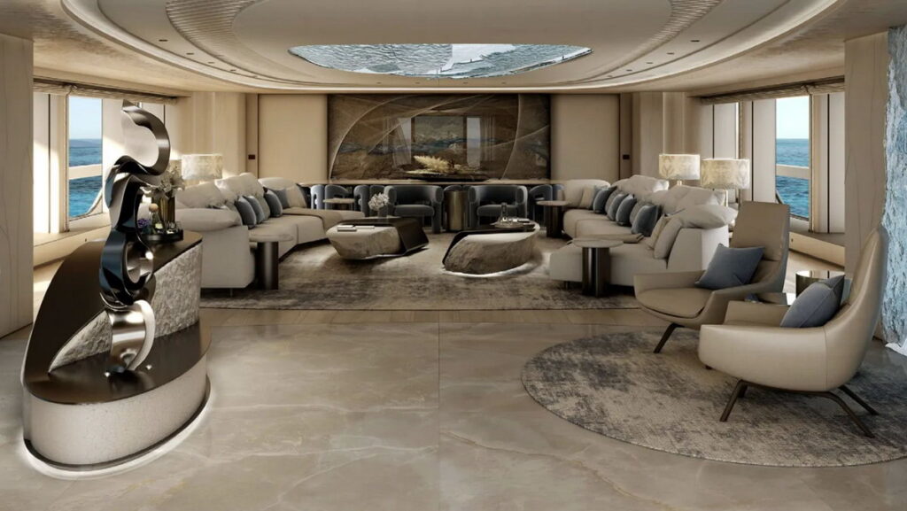 Internally, the study provides for the use of high-specification materials, including select Statuario marbles, premium leathers, and refined oak or ebony wood. The spatial layout is engineered to accommodate a large number of guests in high-end cabins, with specific provisions for the total privacy of the owner’s quarters. The owner’s suite occupies a significant portion of the upper deck, featuring private lounges and exclusive outdoor terraces.