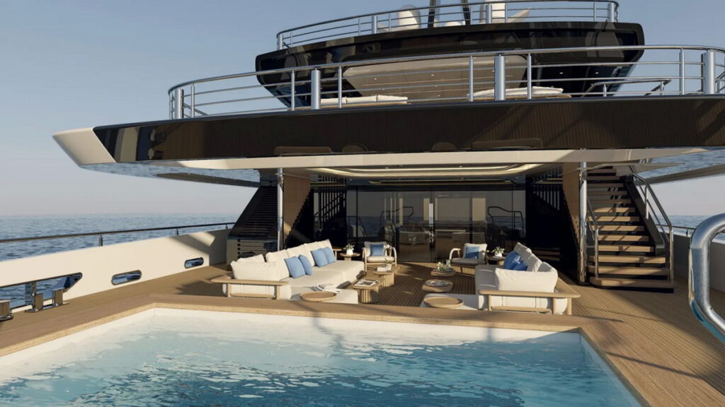Project O’Ceanis is expected to incorporate a series of technological innovations concerning both comfort and functionality. The primary infrastructure includes an extensive Beach Club at sea level, featuring side platforms that increase the deck area when the yacht is at anchor. Furthermore, plans include a comprehensive wellness center with a spa, a gym, and a large swimming pool equipped with temperature control and counter-flow swimming systems.