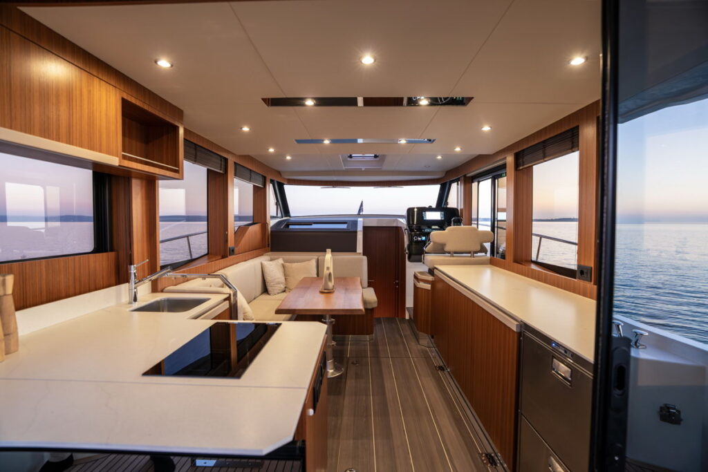 A primary focus of the redesign is the cockpit, which now offers unprecedented flexibility. Working with the Greenline design team, Casali remodeled the layout to accommodate a generous four-person table on the centerline with comfortable sofa seating on either side. Alternatively, Greenline has introduced options that include a drop-down aft platform and an open space for sunbathing and lounging. By utilizing existing space more effectively, the boat provides a greater sense of volume than its predecessor.