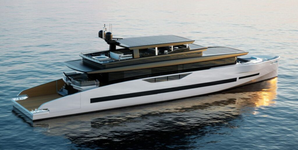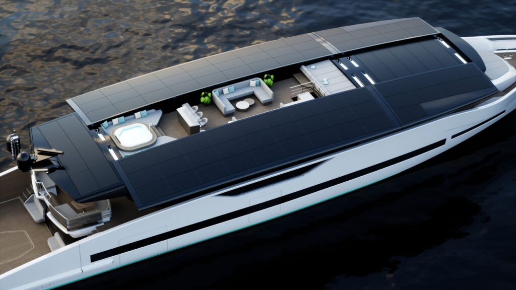 At the heart of the GX42 is a serial hybrid propulsion system that combines diesel-electric power with large battery banks and extensive solar arrays. The solar panels can produce up to approximately 27 kW in the RPH version, while in the Coupé configuration, total solar power can reach up to 39 kW, depending on the setup. This energy, combined with latest-generation batteries, allows for significant electric autonomy without the use of generators or main engines.