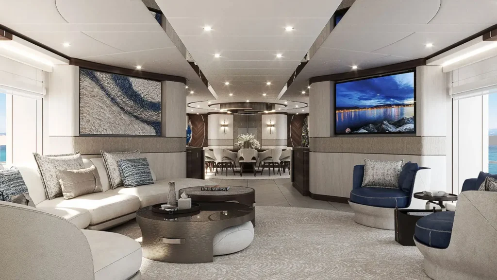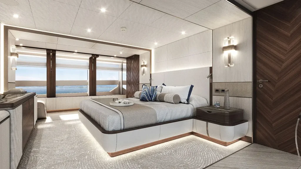 Designed for active exploration, the beach club is configured as an activity-focused hub with tailored stowage for wakeboards and land-exploration bikes, opening directly onto a fold-down swim platform. On the sundeck, a sliding-door windbreaker ensures guests can enjoy these elevated social spaces in total comfort, even while cruising.