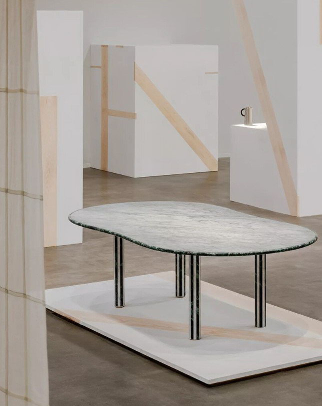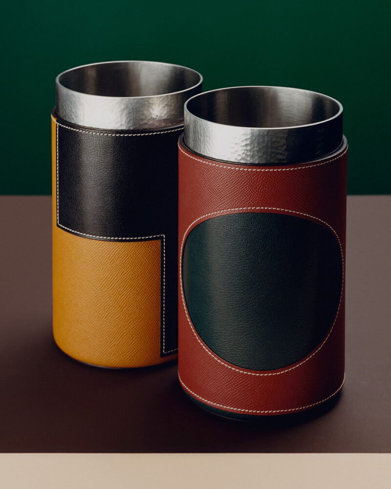 The layout, envisioned as a low-lying urban landscape, grants the pieces of the collection a structural significance. At the center of this wooden topography sits a marble table by Barber and Osgerby, featuring a soft figure-eight silhouette. Despite the inherent weight of the stone, its slim legs and equestrian-inspired marquetry surface lend it a sense of airy refinement. This central element serves as a landmark, around which other objects—such as hammered palladium vessels -are strategically positioned. These vessels, occasionally wrapped in leather or horsehair, shift from reflective to matte finishes depending on the viewer’s angle, creating a quiet yet consistent material rhythm throughout the “city.”
