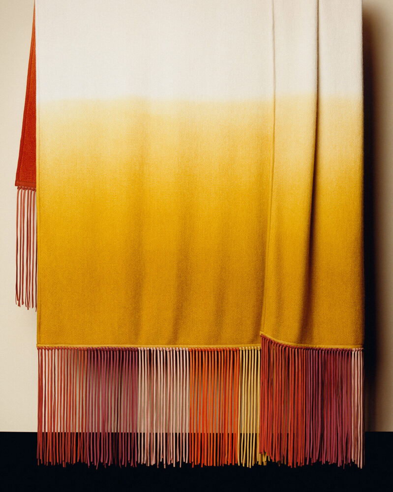 The strength of the 2026 collection lies in the intimate relationship between the objects and the geometric surfaces they occupy. Leather marquetry boxes introduce vibrant color blocks that mirror the installation’s grid, while baskets adorned with small circular appliqués appear as points scattered across a field. This theme of structured placement extends into the textile collection; cashmere throws are transformed through resist-dyed patterns and intricate stitching. Drawing on the Korean bojagi technique, some pieces use visible seams to organize their surface into subtle grids, while others feature ribbed edges inspired by equestrian webbing to provide form and stability to the fluid fabric.