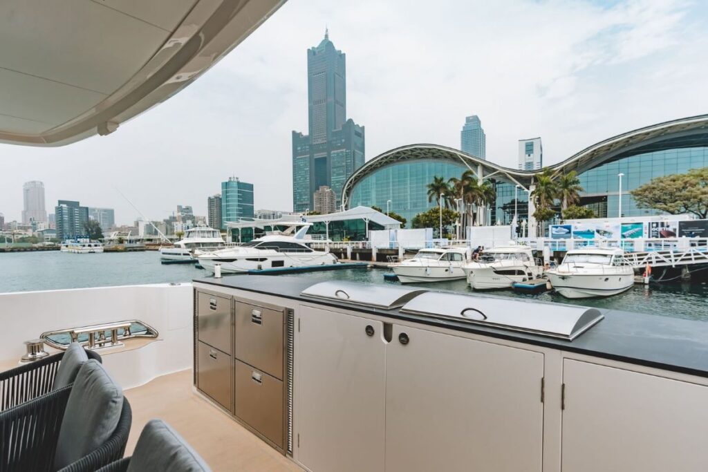 Outdoor spaces on KEΦI are designed for ultimate enjoyment. The foredeck offers a dedicated sunbathing area with dual-purpose folding sunpads and integrated RGB lighting. Aft, the expansive deck serves as an exceptional alfresco dining room, fully protected by an electric retractable awning and equipped with a complete outdoor kitchen, including a teppanyaki grill, BBQ, drawer fridge, and ice maker.