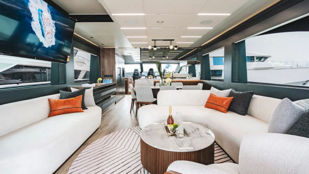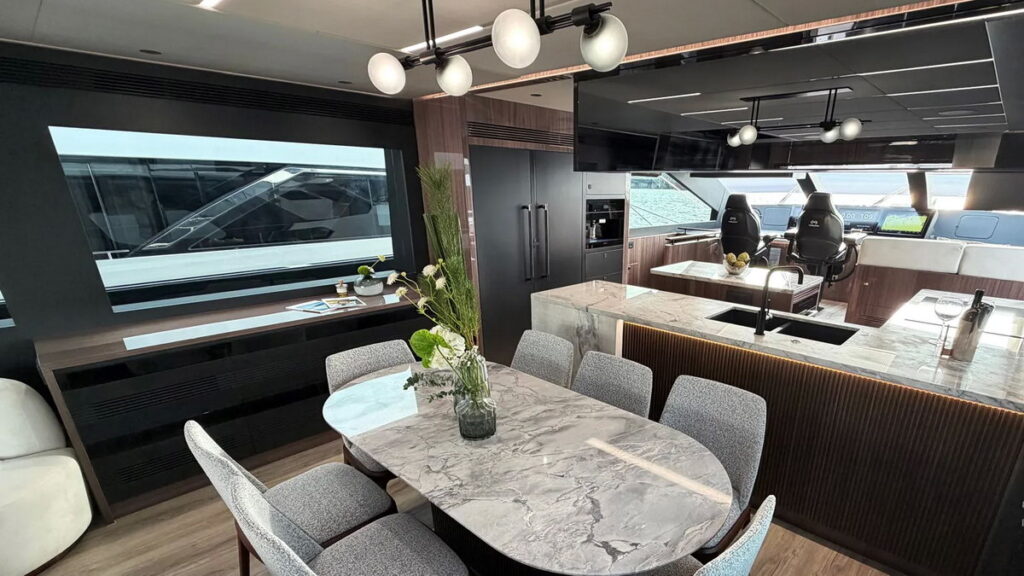 The ES88’s interior emphasizes a clean, modern aesthetic. The main deck features vinyl wood flooring that visually extends the space, complemented by a matte white and leatherette ceiling. The salon invites relaxation with a white curved sofa and a marble-topped walnut coffee table, while a hidden drop-down TV ensures unobstructed views. This area flows seamlessly into the dining space—featuring a marble table with a titanium and walnut base—and the fully equipped galley. The galley boasts dark grey matte cabinetry, high-gloss Koto wood louvers, and stone countertops, creating an elegant yet highly functional culinary hub.