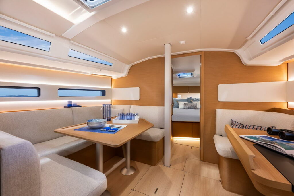 This ergonomic approach significantly simplifies maneuvering, making the boat friendly even for shorthanded crews or families. The integrated bowsprit and the strategically placed winches further enhance the yacht’s character as a modern cruiser that does not sacrifice speed for comfort.