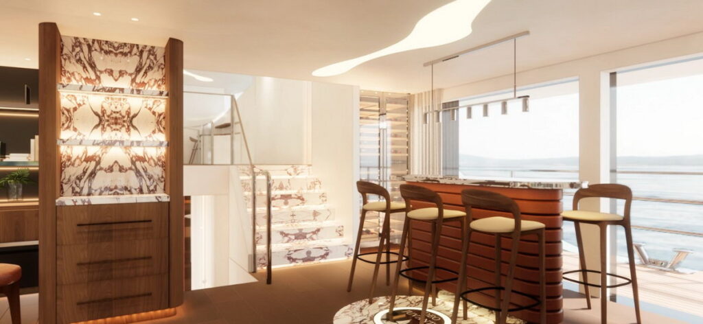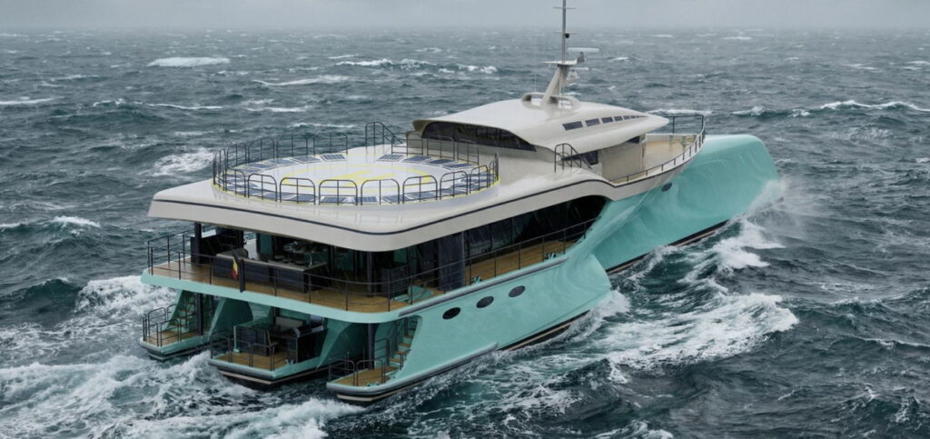 The architectural foundation of the TS40 is rooted in efficiency and speed. Designed by the renowned New Zealand-based firm LOMOcean, the yacht features a distinctive inverted bow that pierces through waves rather than riding over them, ensuring a smooth journey even in challenging maritime conditions.