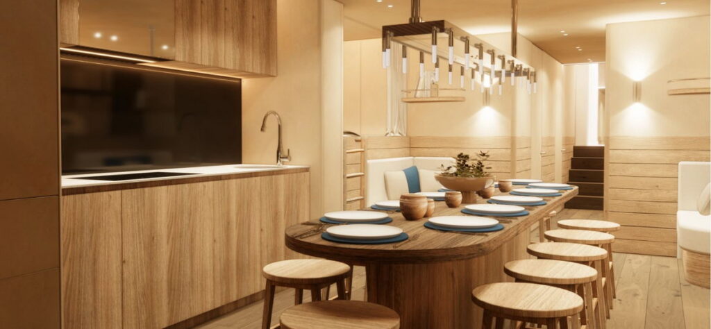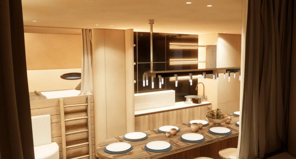 Inside, the TS40 offers a unique dual-personality layout envisioned by designer Kurt Wallaeys. The main deck is crafted to exude a sophisticated superyacht atmosphere, perfect for entertaining and social gatherings in glamorous ports. In contrast, the lower deck is designed with a more practical explorer vibe, catering to the functional needs of long-term life at sea. The yacht accommodates up to twelve guests across six cabins, with a master suite that offers panoramic views and a direct connection to the surrounding seascape.