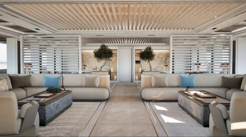 One of the most striking features of the main deck lounge is an automated wooden pergola system. This isn’t just a static architectural element; it is integrated with a kinetic light installation designed to mimic the shifting shadows and dappled sunlight of a real Caribbean terrace. This interplay of light and shadow is complemented by a bar crafted from raw stone and worked wood, which serves as a focal point for social gatherings. A long teak walkway bisects the lounge areas, featuring custom carpets with wave patterns and low-profile sofas that emphasize the horizontal, expansive feel of the interior.