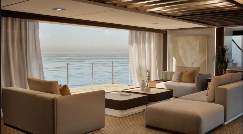Project Opal incorporates several “signature Mulder Design” elements, most notably the flared bulwarks on the forward sections of the upper two decks. This architectural choice serves two purposes: it significantly enhances the line of sight from the interior and allows for a much larger private forward deck for the owner. While the current configuration includes a guest skylounge aft, the studio has emphasized the project’s inherent flexibility. The upper deck can be entirely reconfigured into a massive, dedicated owner’s deck, providing an unparalleled level of privacy and luxury for the primary residents.