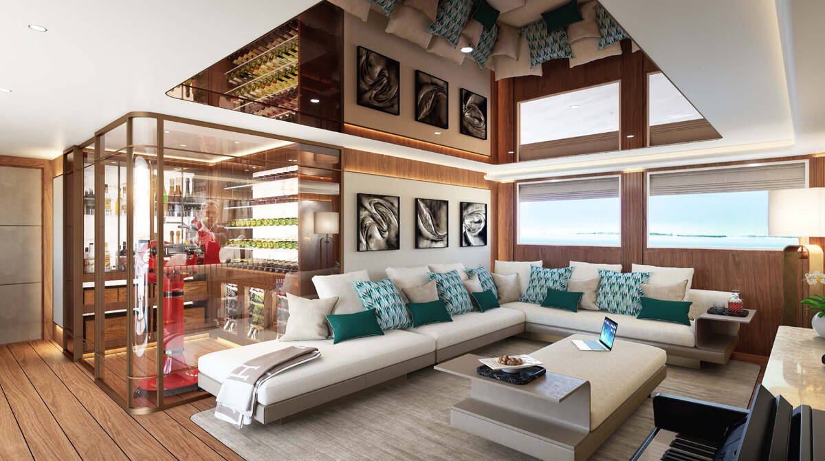 Guests of all ages will no doubt also be taken with the social areas, which include a private forward saloon on the main deck with an open balcony overlooking the sea. This versatile lounge can serve as a study, cinema, spot for music or simply a space for relaxation – aided, of course, by a large, glazed wine cellar that stores bottles in a controlled environment.