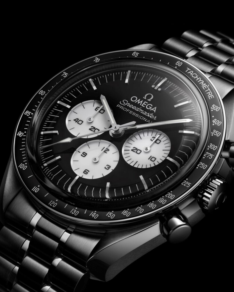 In combination with the black and white dial, the new watches include black ceramic bezel rings filled with a tachymeter scale in white enamel. The front features a box-form scratch-resistant sapphire crystal with an anti-reflective treatment. Around the wrist, the watches are distinguished by their polished-brushed bracelets, created in the standard Moonwatch style with OMEGA’s patented comfort release adjustment system.